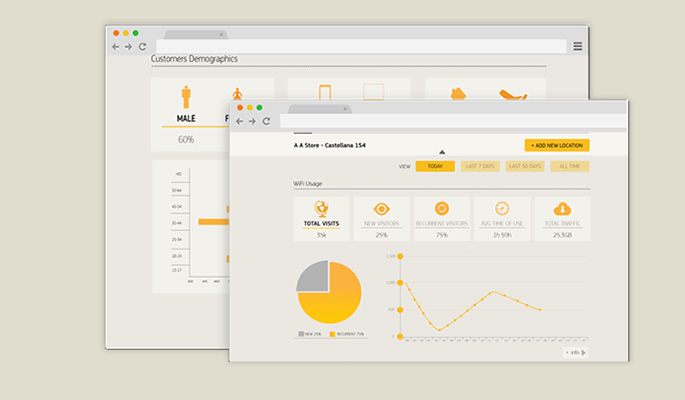 来店者がWi-Fiを利用した結果をダッシュボードから 確認出来ます。Facebookを行っている場合、ユーザーの 性別、年代、国籍なども知ることが出来ます。 サービスの改善、メニューの変更にお役立て下さい。